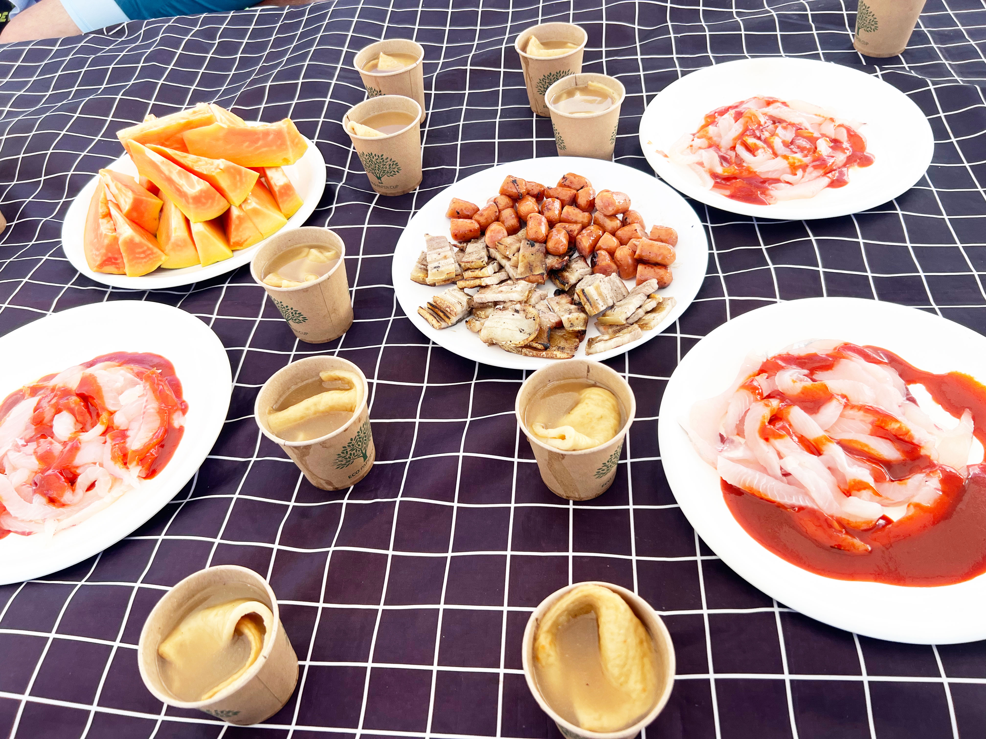과일과 음료, 오뎅탕, 삼겹살 등 먹을 것을 보니 언제 멀미를 했나..싶을 정도로 많이 먹었어요.