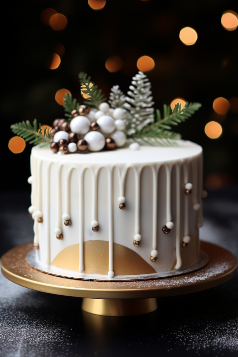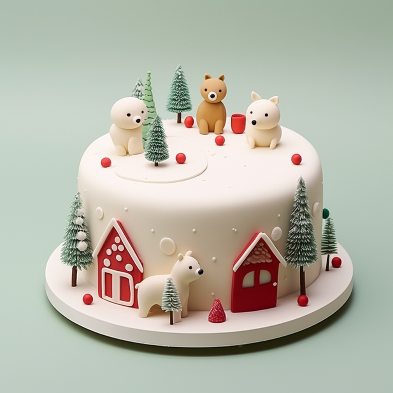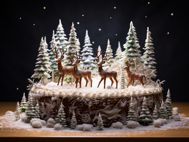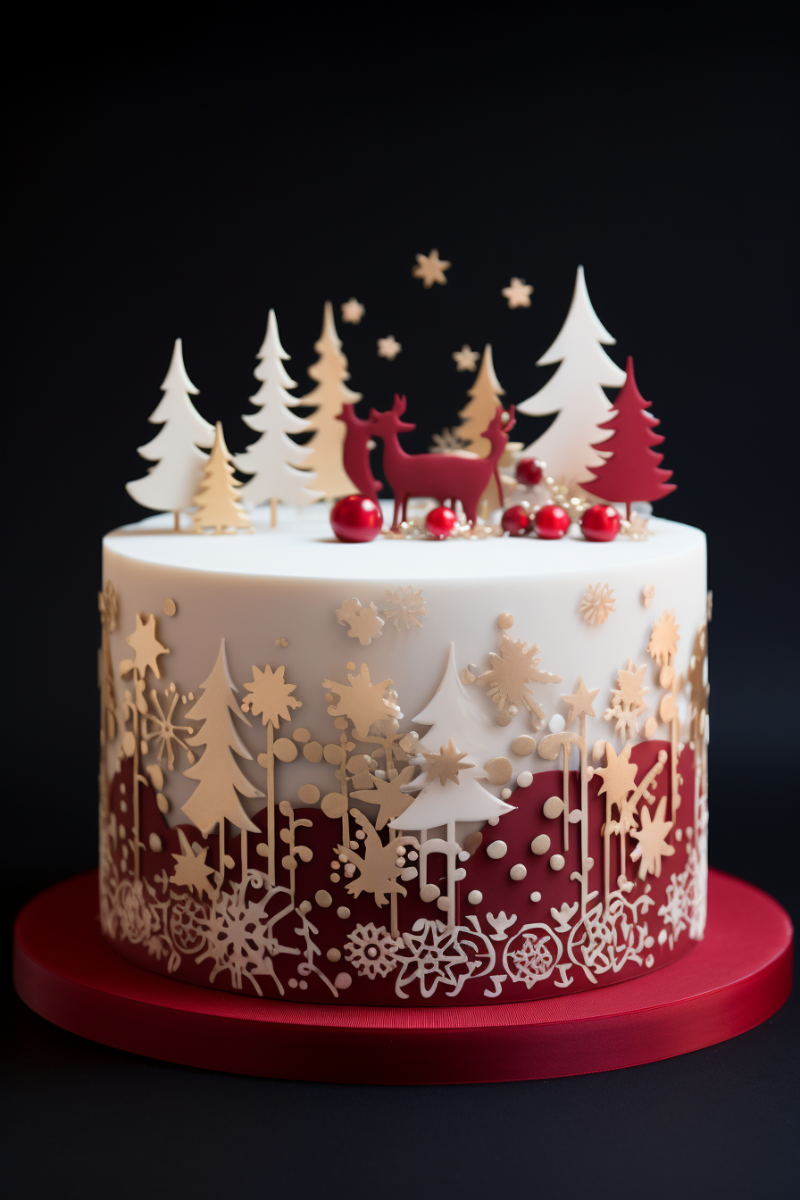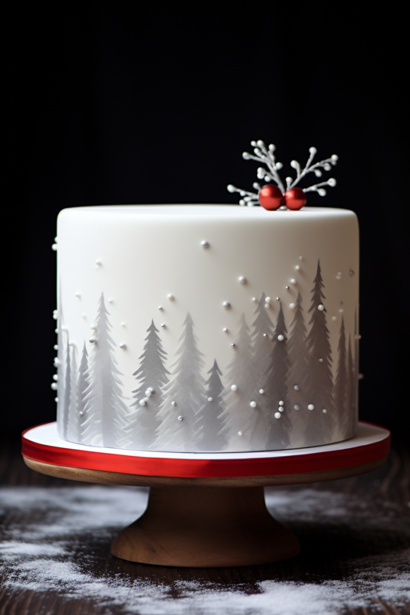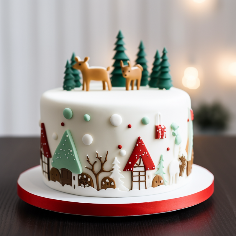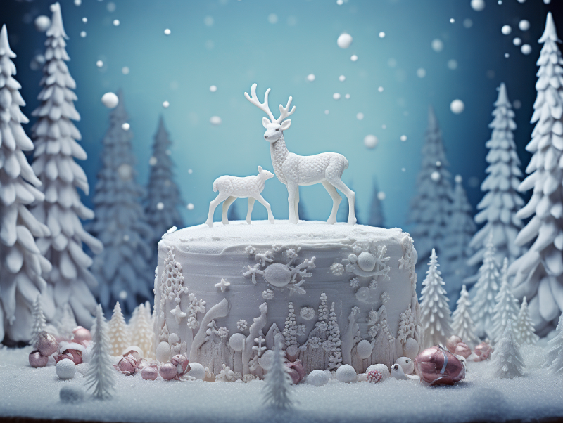 화이트 크리스마스를 떠올리는 하얀 눈 장식과 루돌프로 장식된 케이크 디자인, 깔끔해요!