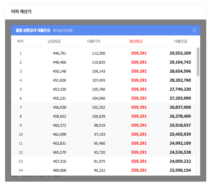 월 상환금과 이자를 확인할 수 있어요.