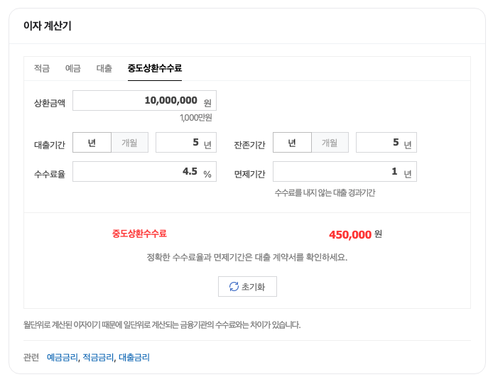 중도상환수수료를 계산해주는 기능도 있어요.