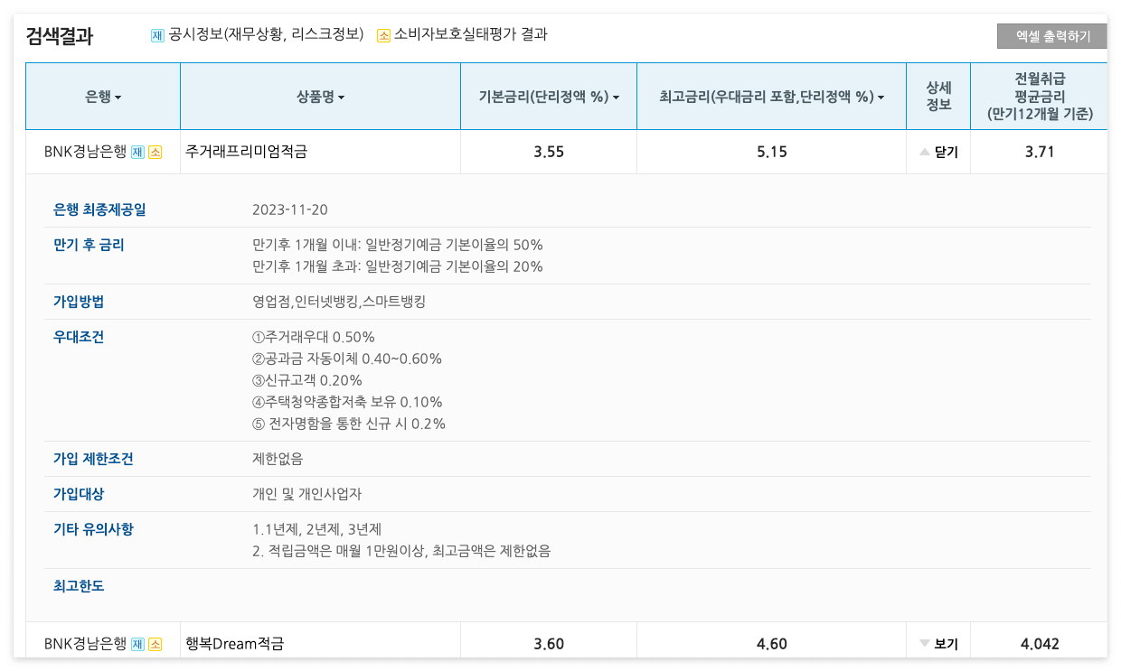 이자방식을 선택하고 엑셀다운로드가 가능한 적금 금리 비교사이트예요.