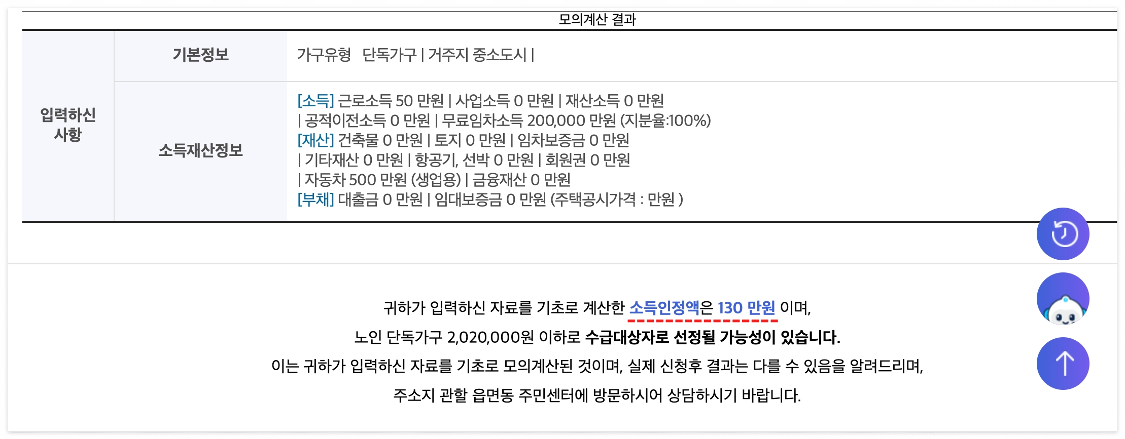 - 기본정보와 소득정보, 재산정보를 모두 입력하시면 아래와 같이 결과가 나오게 되요.