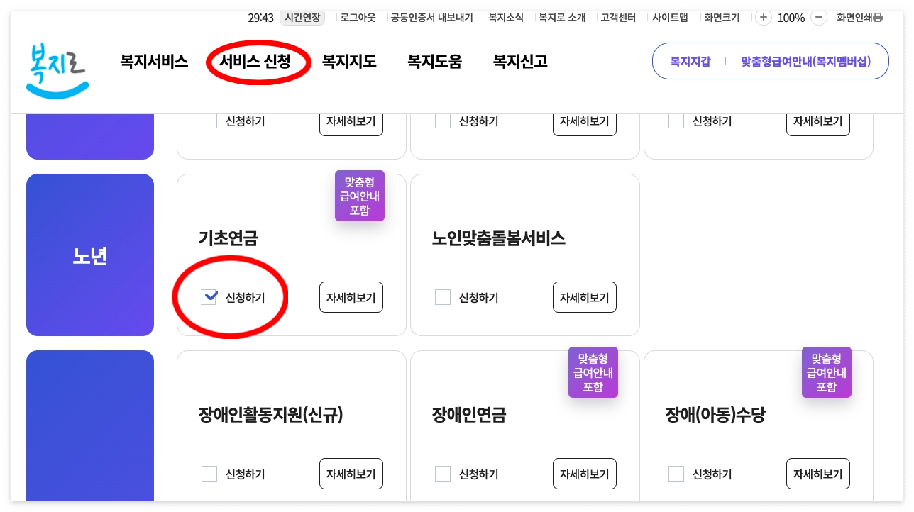 - 기초연금 항목을 찾아 [신청하기]를 체크하고 맨 아래로 내려 [저장 후 다음단계] 버튼을 눌러주세요.