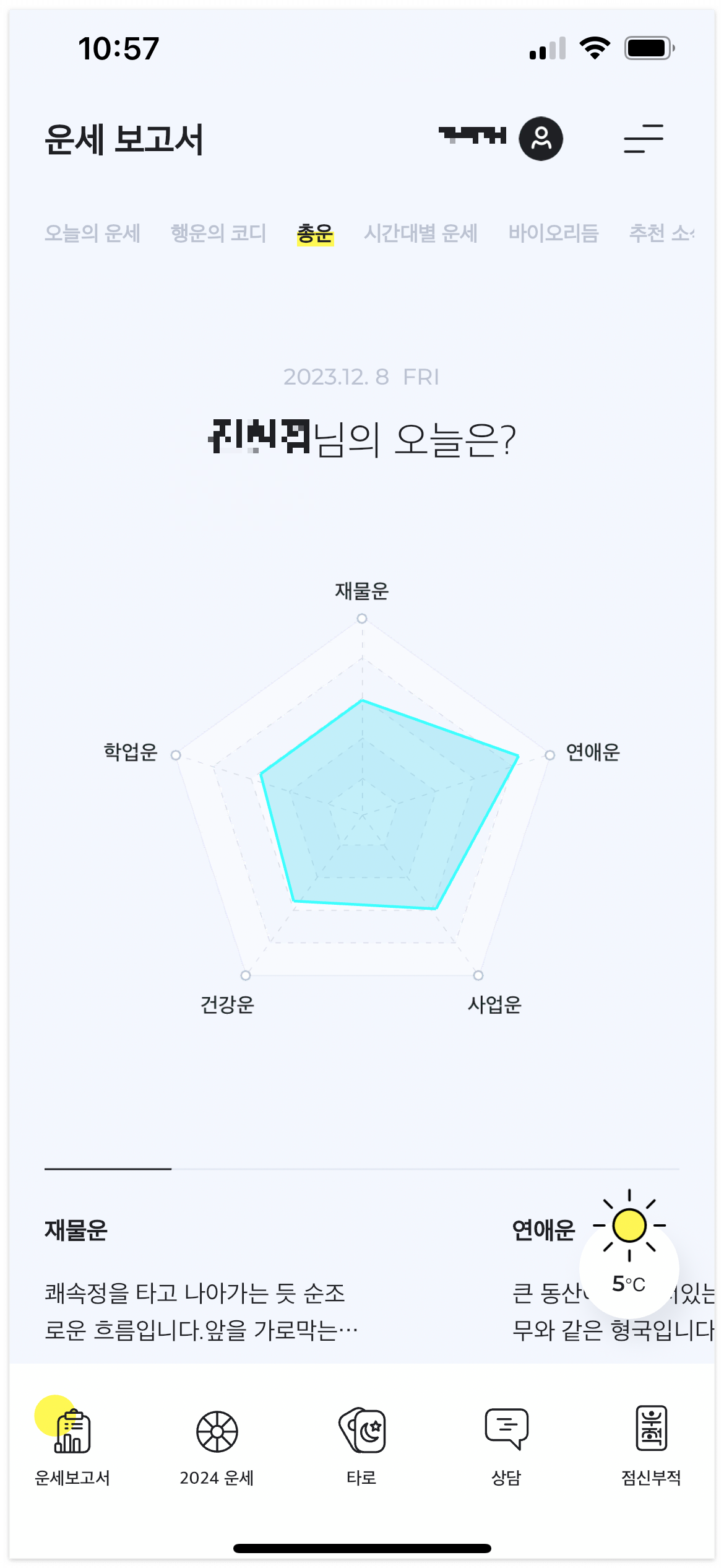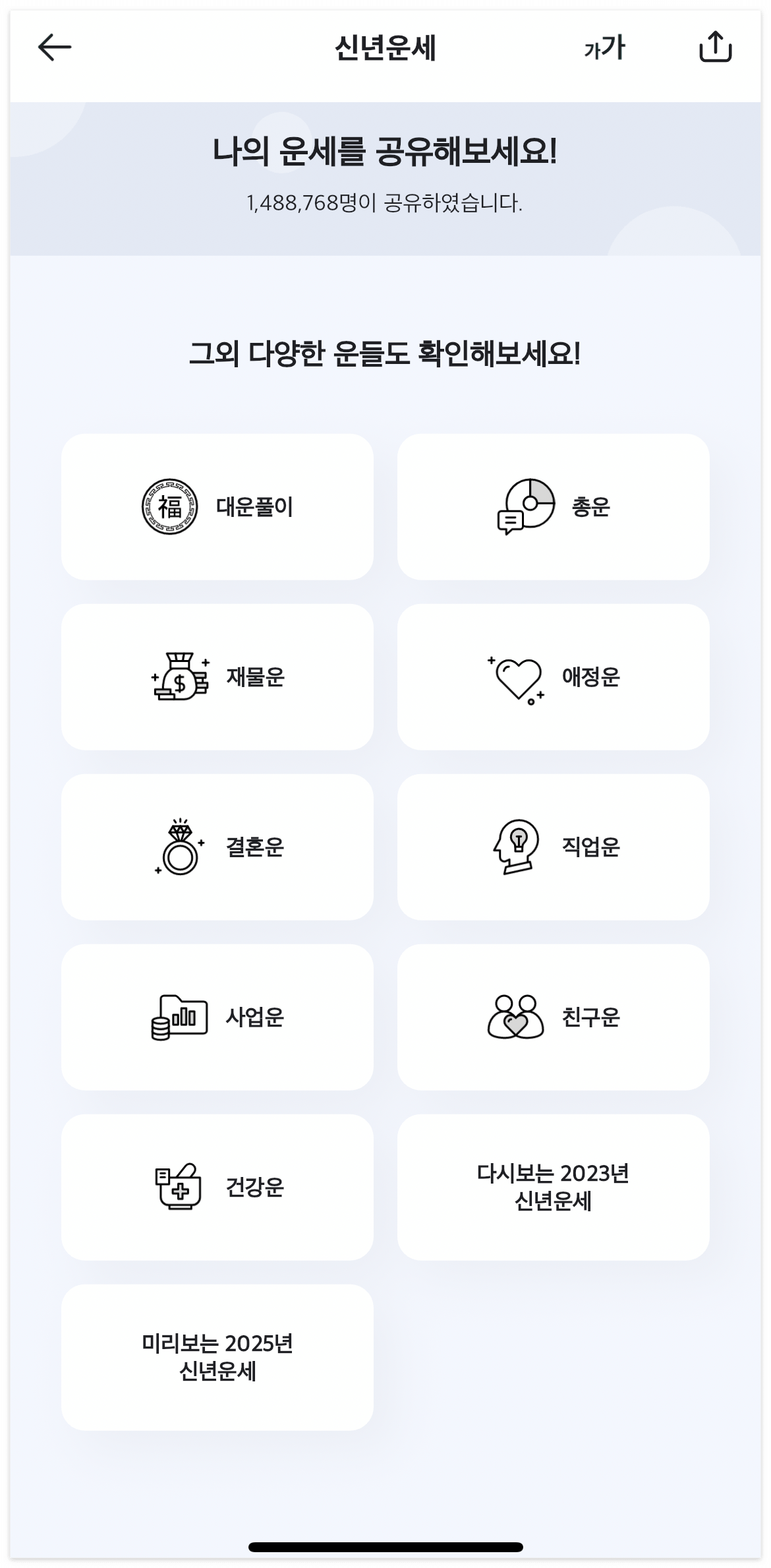 대운, 재물운, 애정운, 결혼운 등 특정운세를 따로 볼 수 있는 기능도 좋아요.