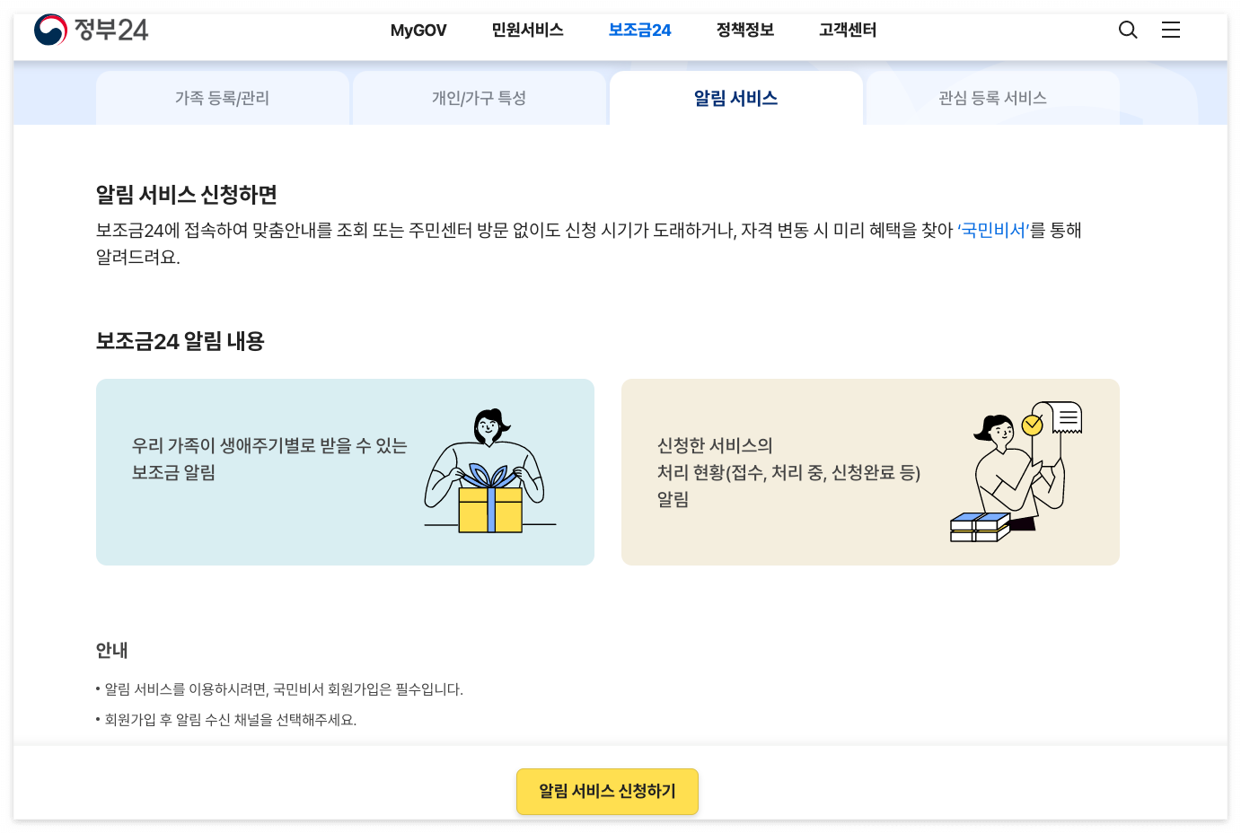 보조금24 왼쪽메뉴에서 알림 서비스 클릭!