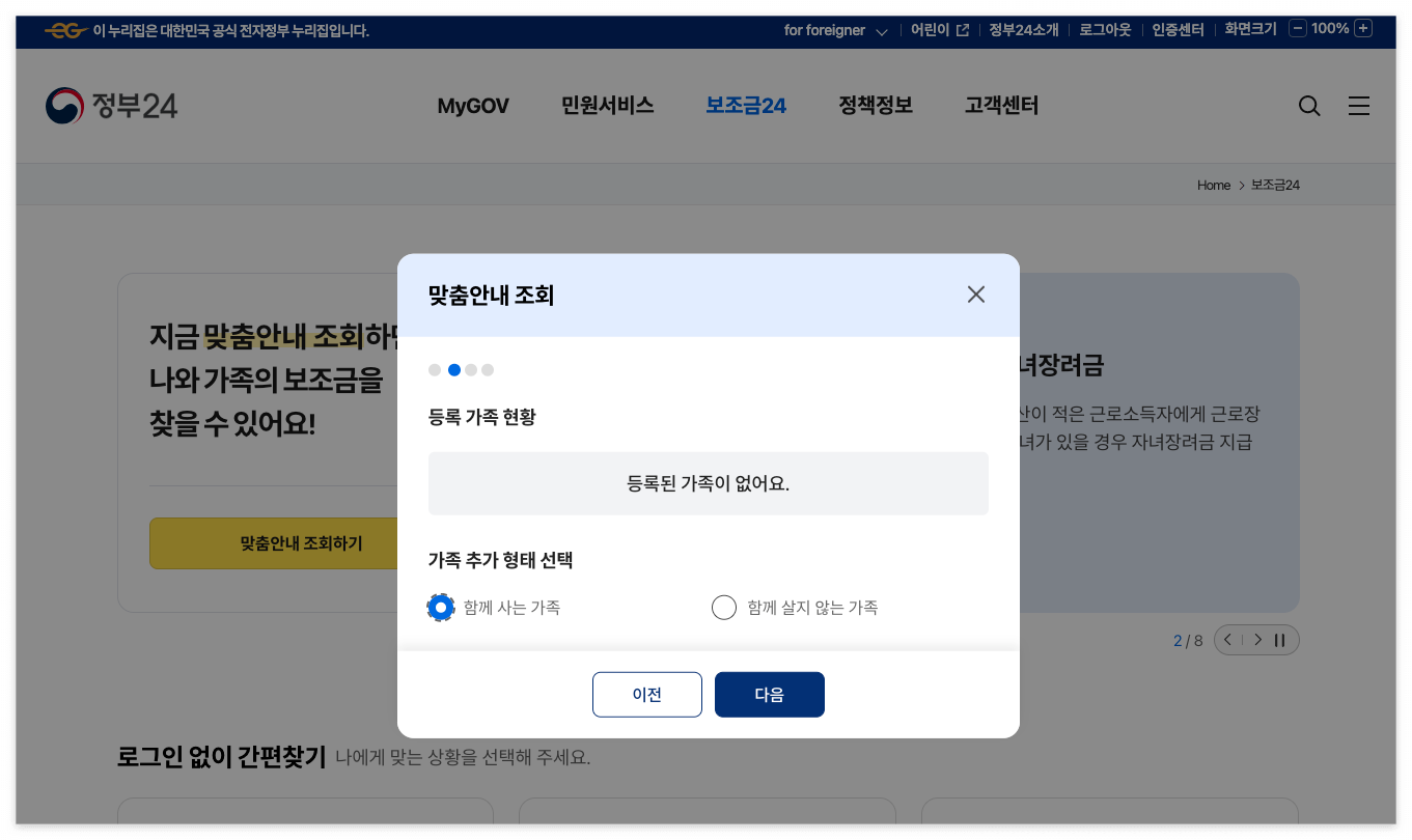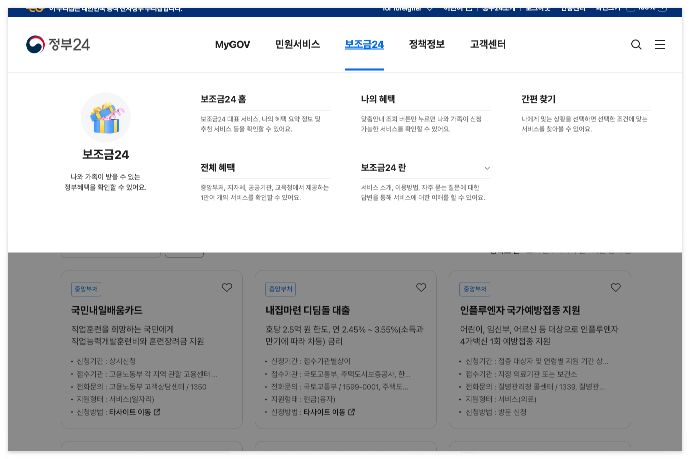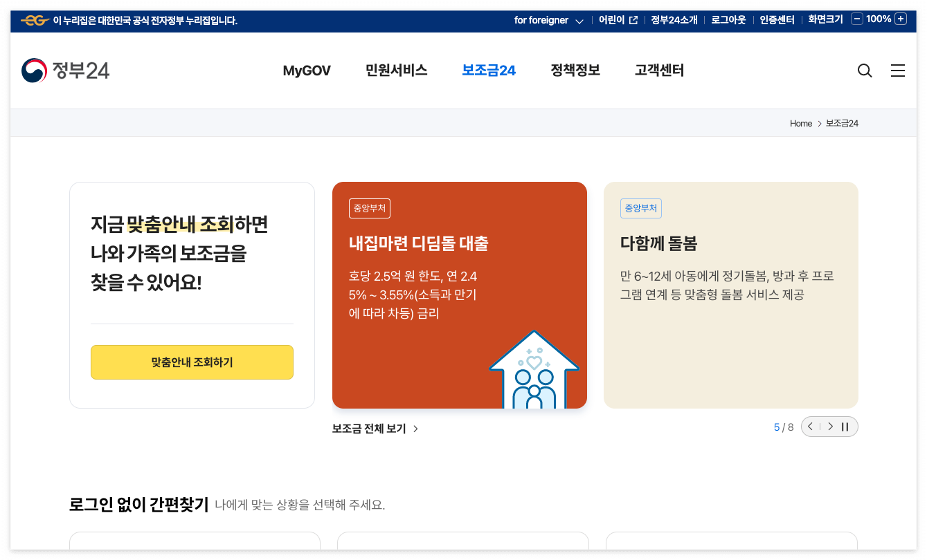 보조금을 받을 수 있는지 여부는 정부24에서 확인이 가능합니다.