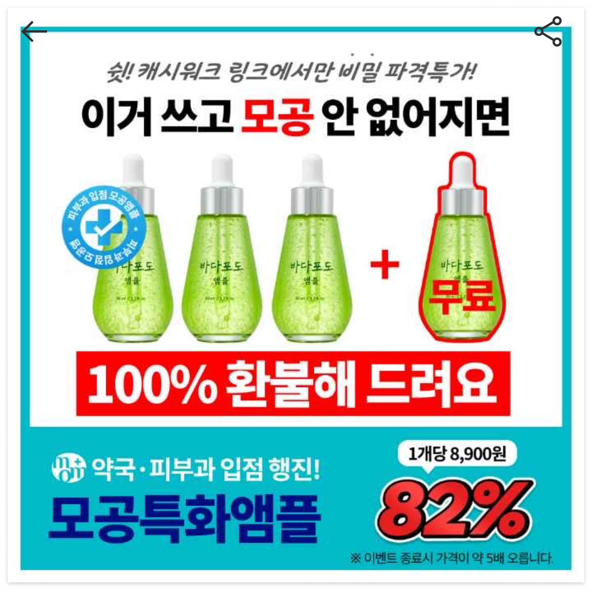 피부과 실제 판매 [바다포도 모공앰플]은 천연 모공톡스 "바다포도"를 앰플 한병에 온전히 담은 특허받은 모공특화앰플 입니다.