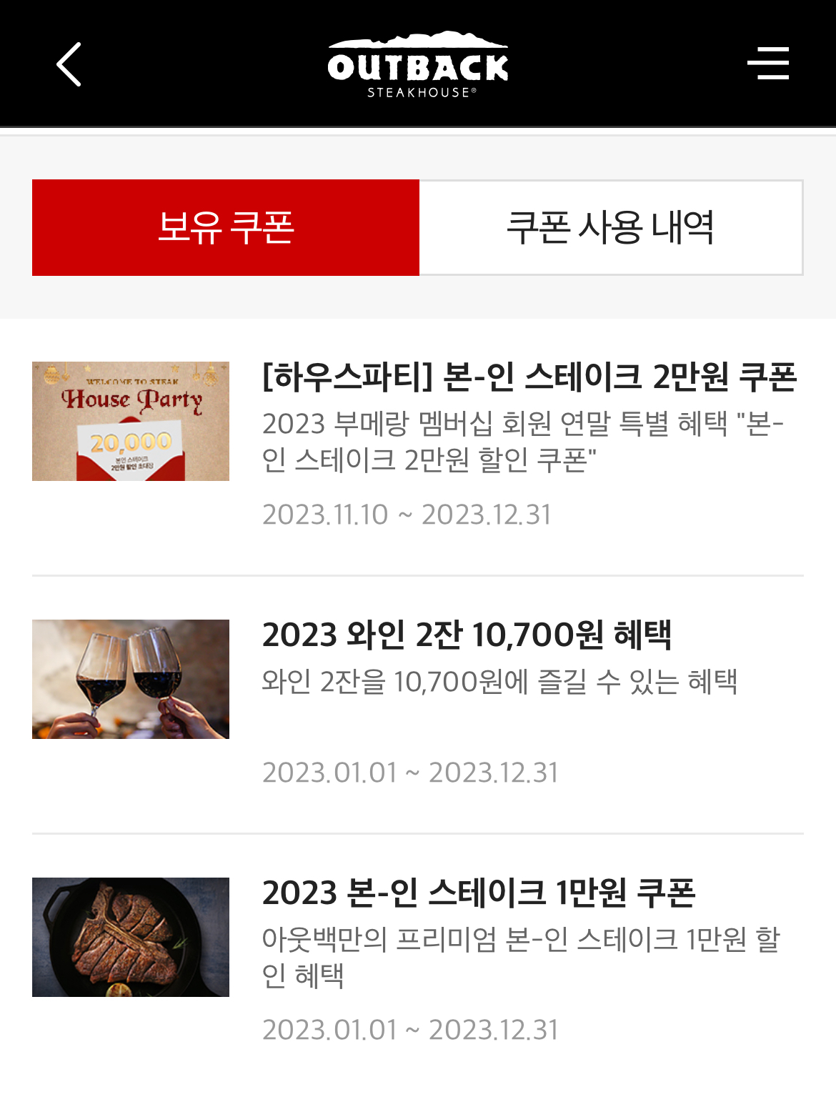 아웃백 어플 다운로드 후 로그인 하시면 연말까지 사용가능한 쿠폰 3장을 받을 수 있어요.