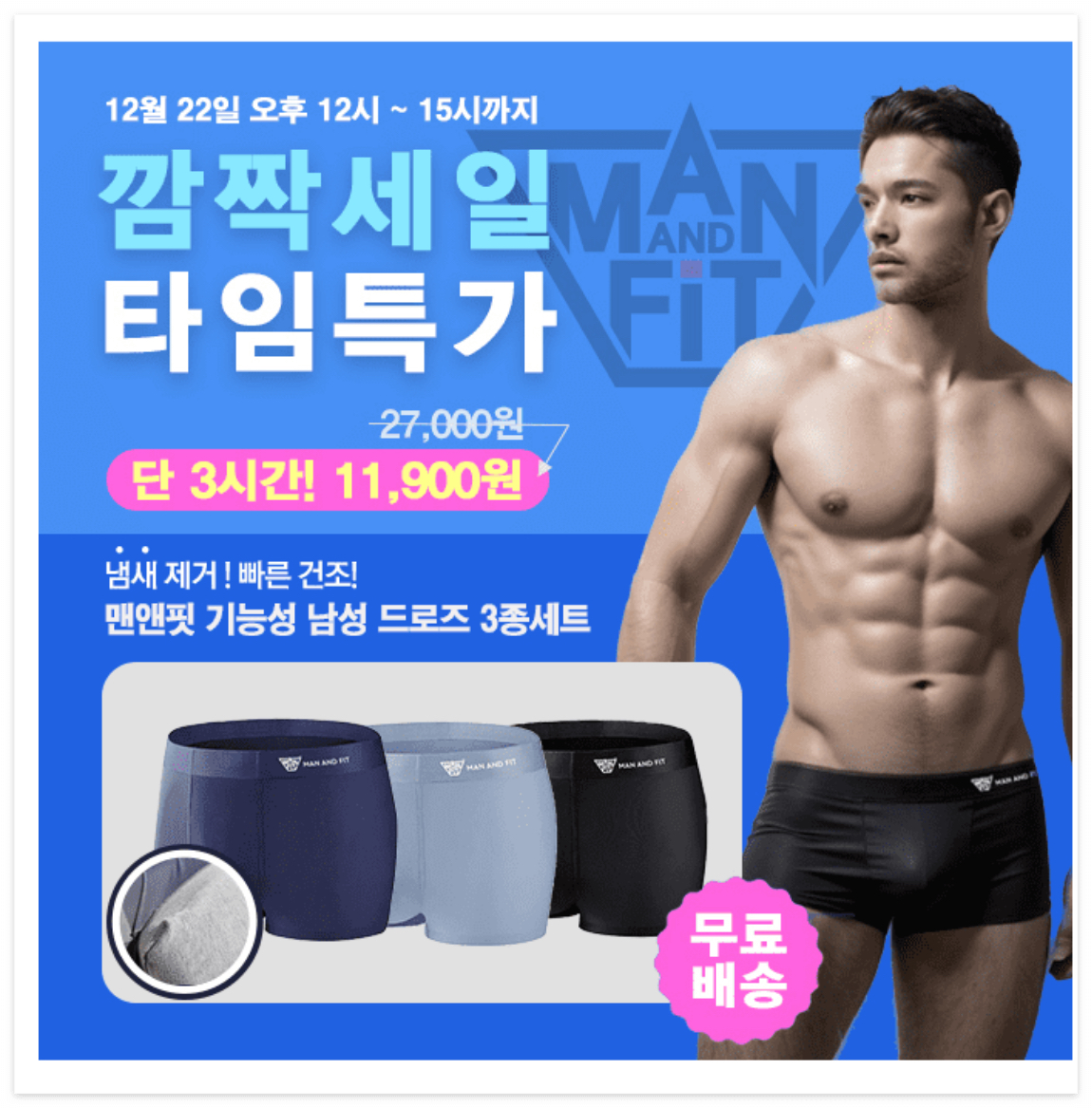 3시간 동안 진행되는 "제로딜" 타임특가에서 "맨앤핏 기능성 소취 에어로스킨 남성 드로즈 팬티 3종 세트"가 11,900원 무료배송 OO% 할인으로 진행됩니다. 빈 칸에 들어갈 숫자는 무엇일까요?