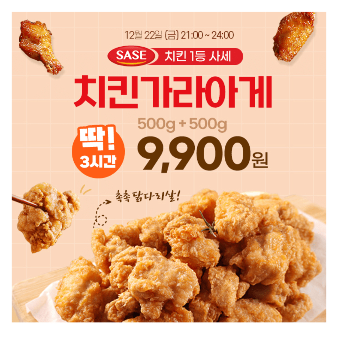 3시간 동안 진행되는 "캐시딜" 타임특가에서 촉촉한 닭다리살로 만들어 더욱 맛있는 사세 치킨 가라아게 500g+500g이 9900원+무료배송 역대급 OO% 할인으로 진행됩니다. 빈 칸에 들어갈 숫자는 무엇일까요?