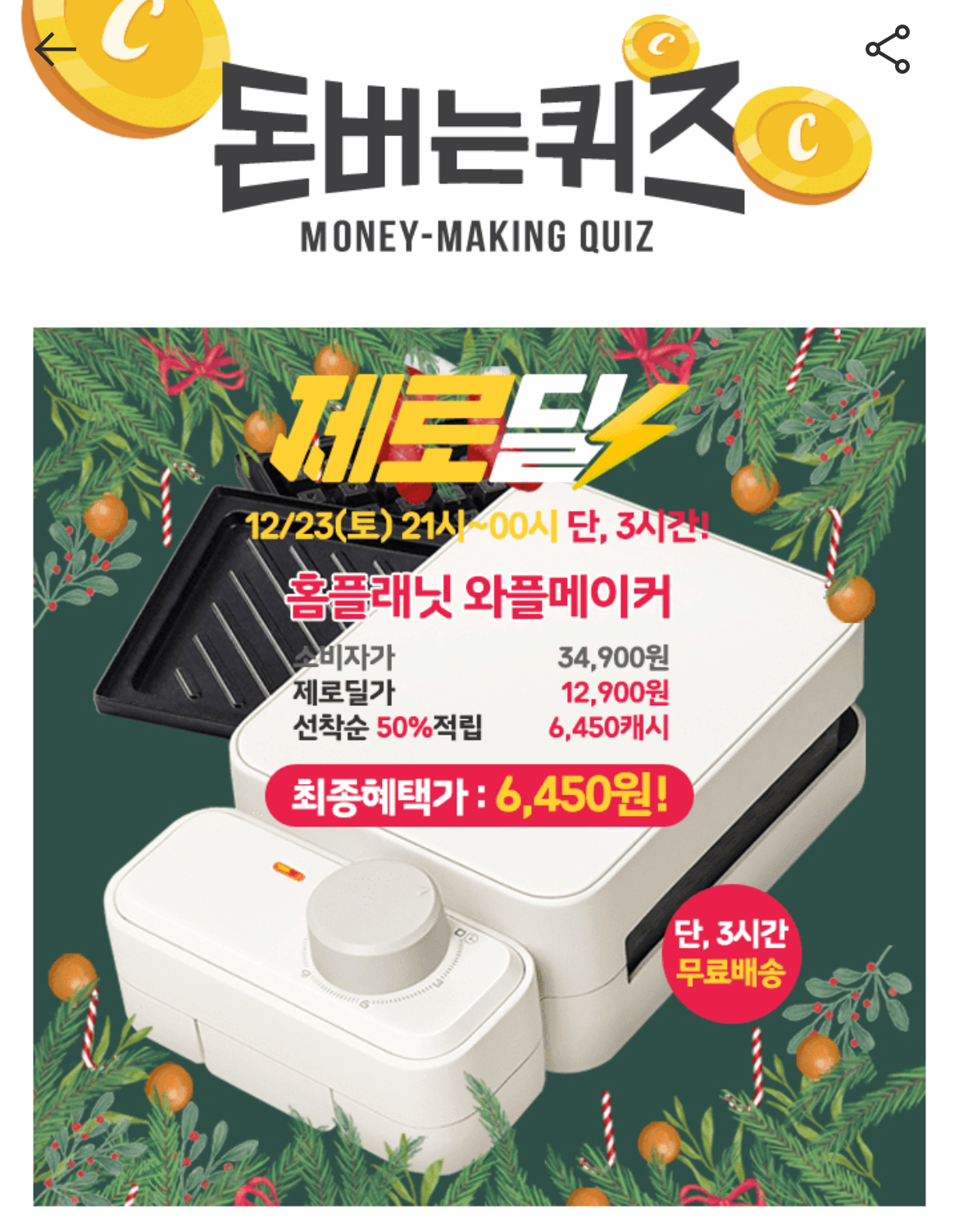 3시간 동안 진행되는 "제로딜" 타임특가에서 "홈플래닛 타이머 와플 샌드위치 메이커"가 12,900원 무료배송 OO% 할인으로 진행하고 50% 캐시적립금(6,450캐시)을 드립니다. 빈 칸에 들어갈 숫자는 무엇일까요?