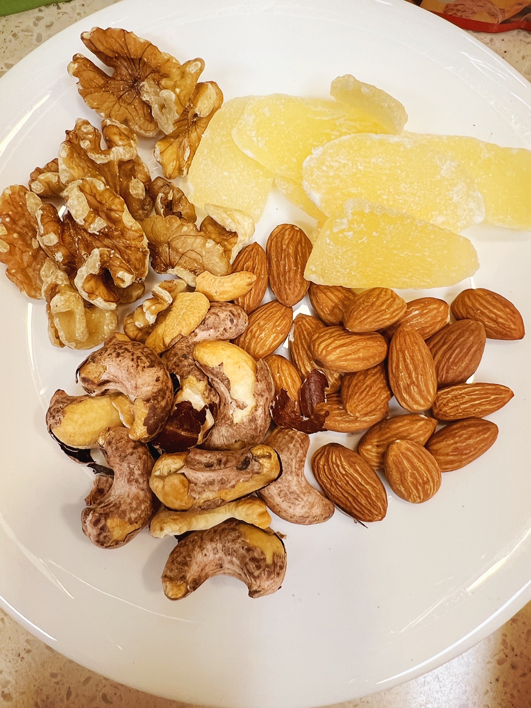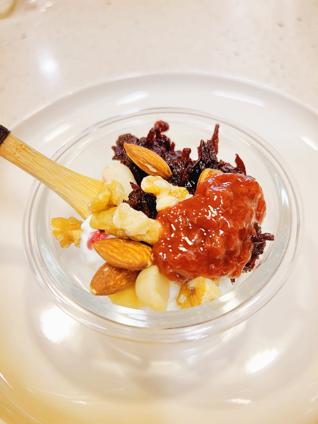 집에 직접 만든 블루베리잼과 생과일이 듬뿍담긴 딸기잼이 있어 견과류와 함께 넣어 먹어요.