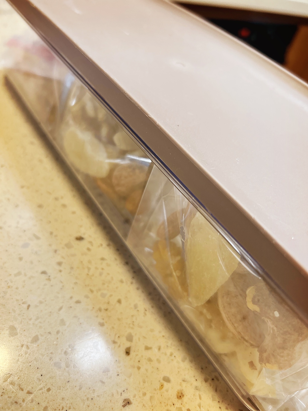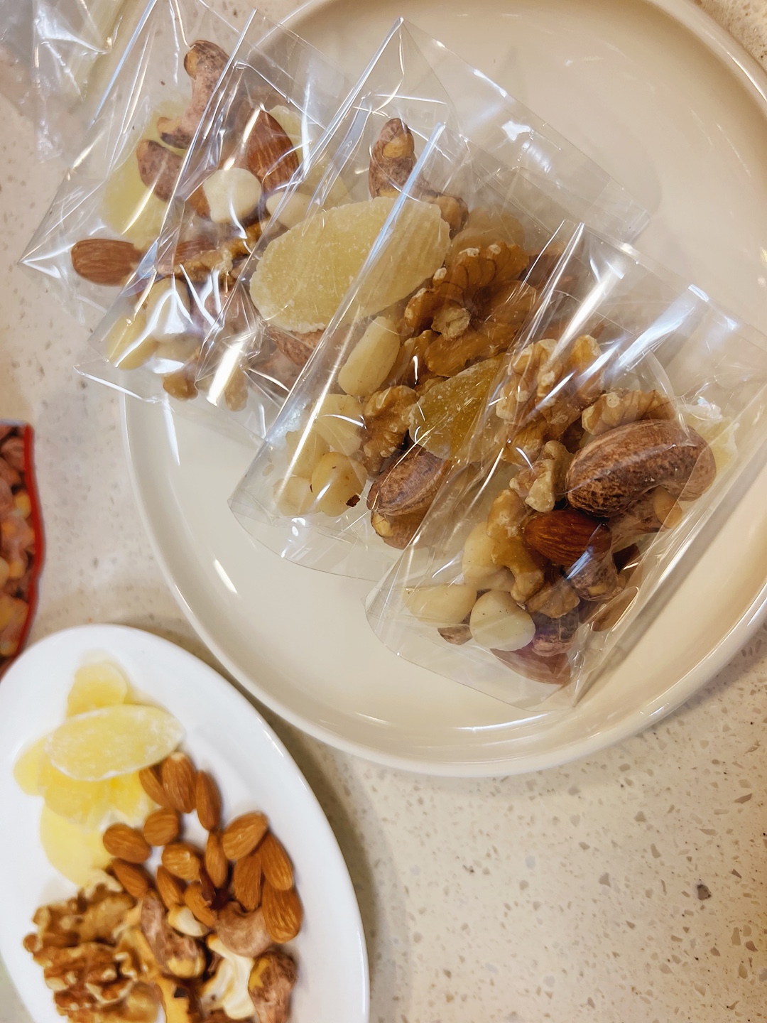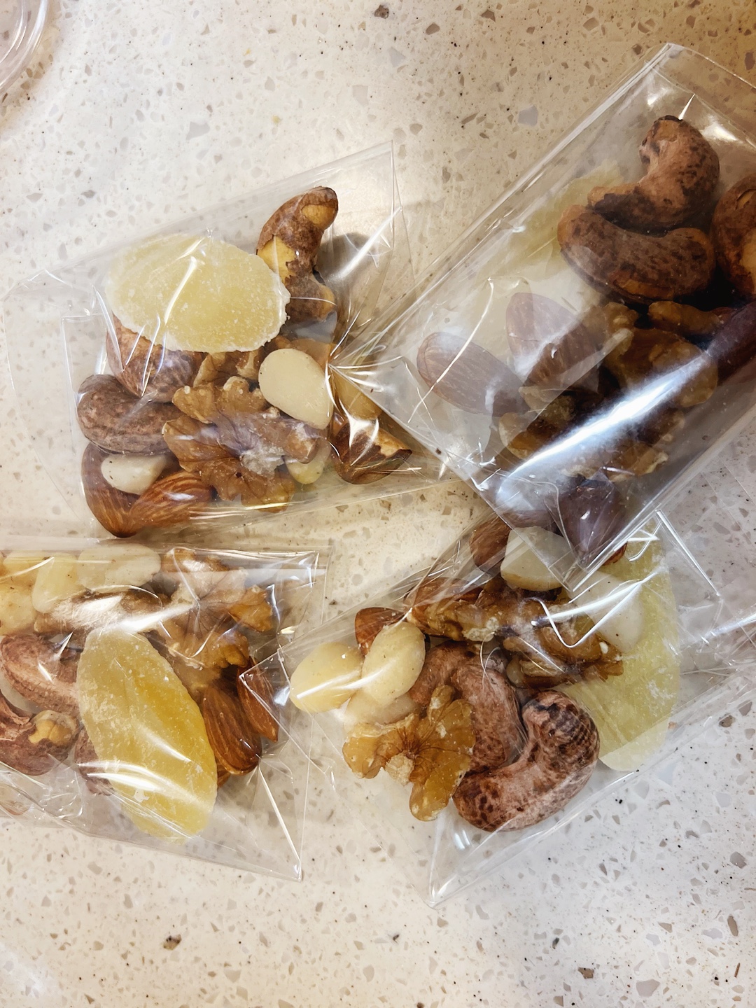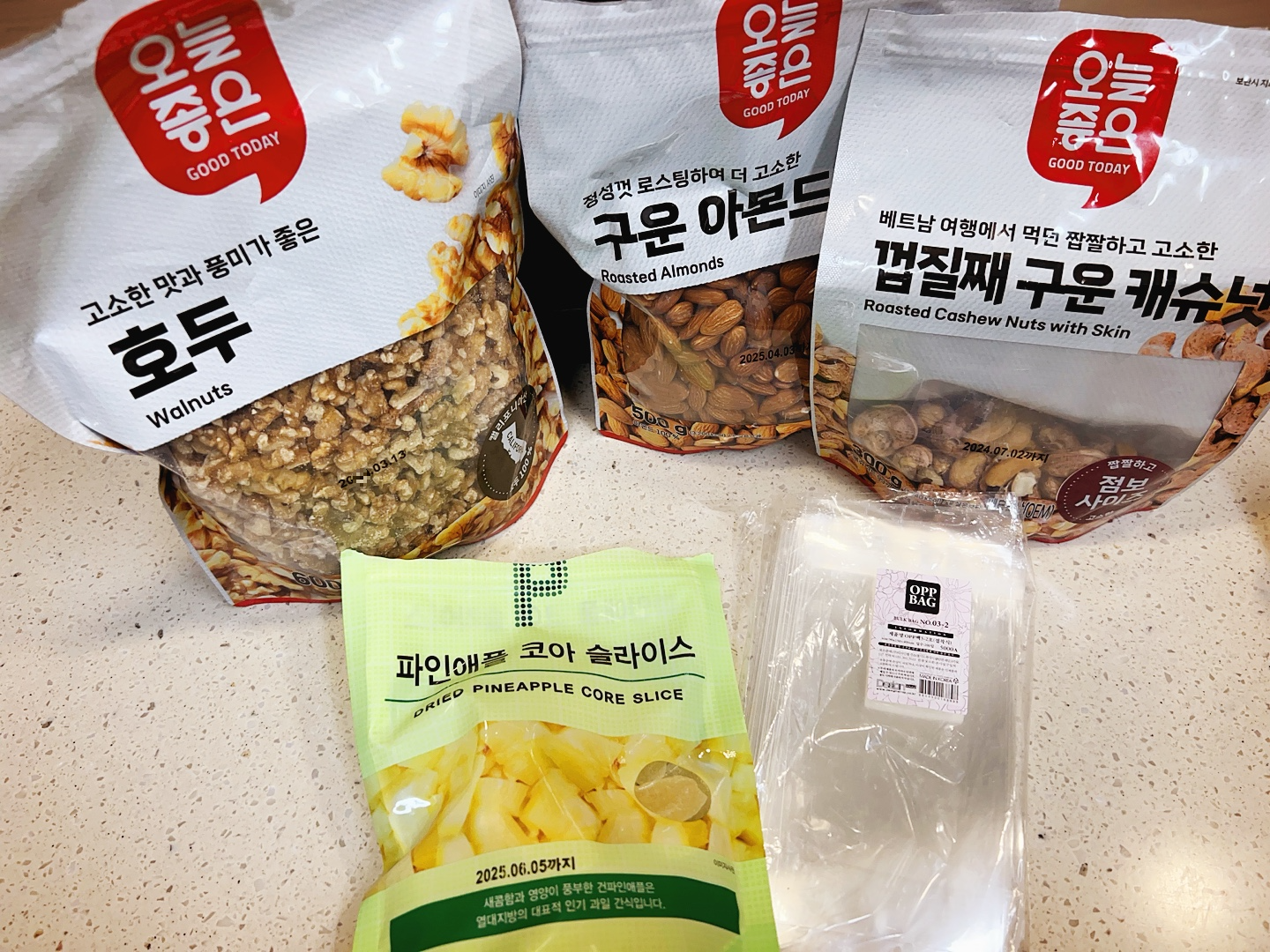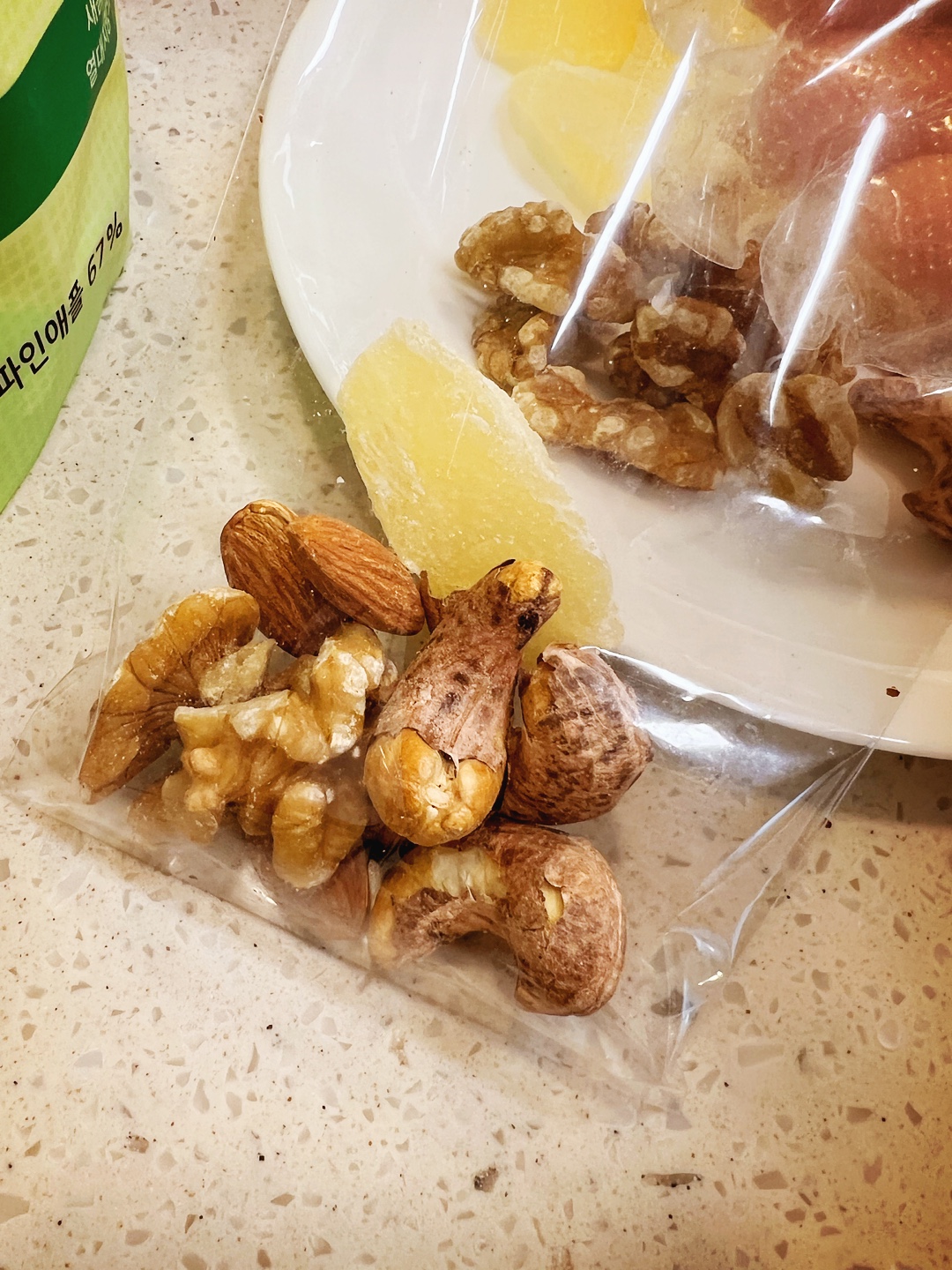 그래서 저는 호두 2~3개, 아몬드 3개, 캐슈넛 2~3개, 파인애플 슬라이스 1개씩 봉투에 담아보았어요.