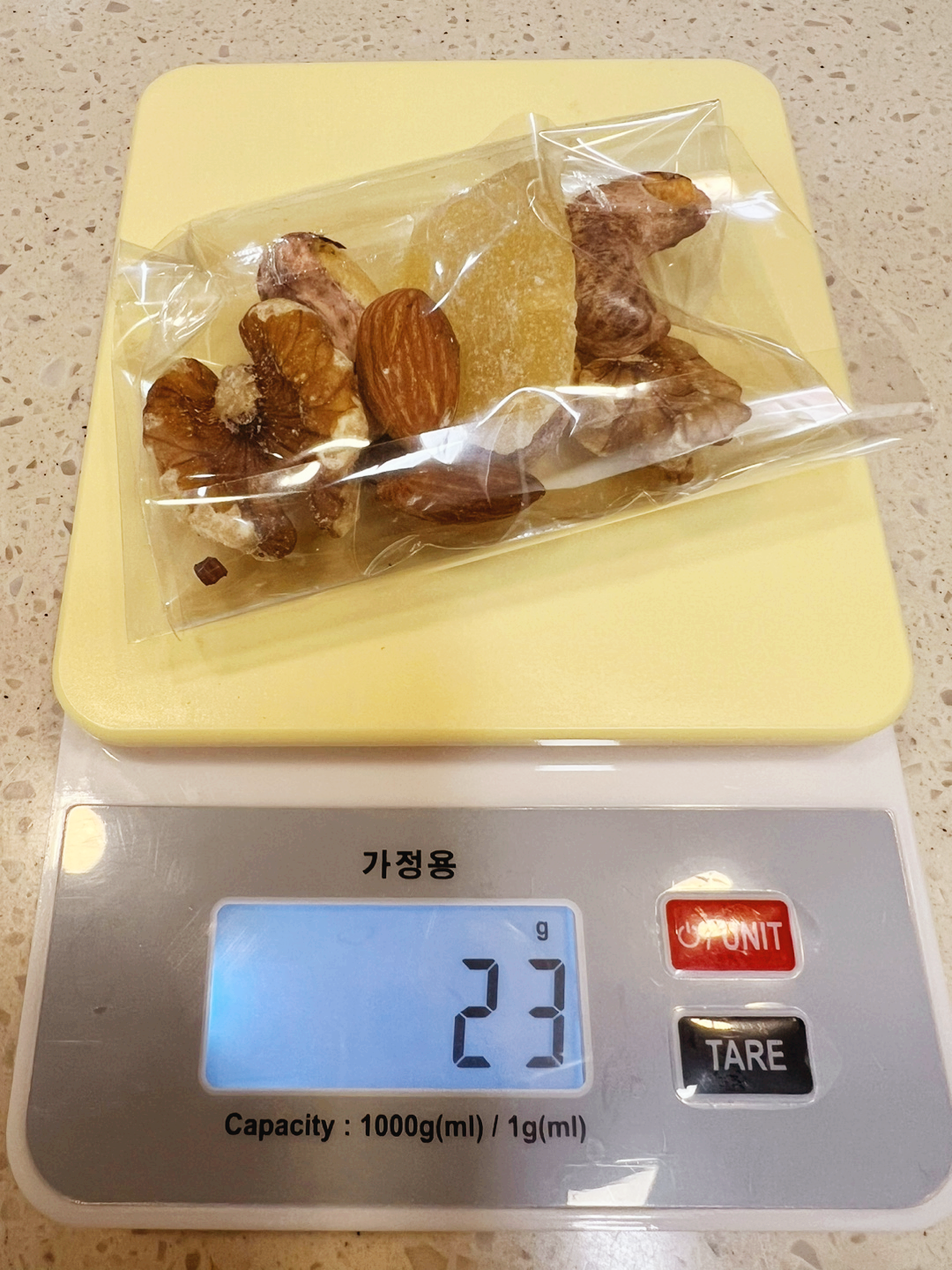 시중에 파는 하루견과류 중가 대략 20~23g 정도 하더라구요.