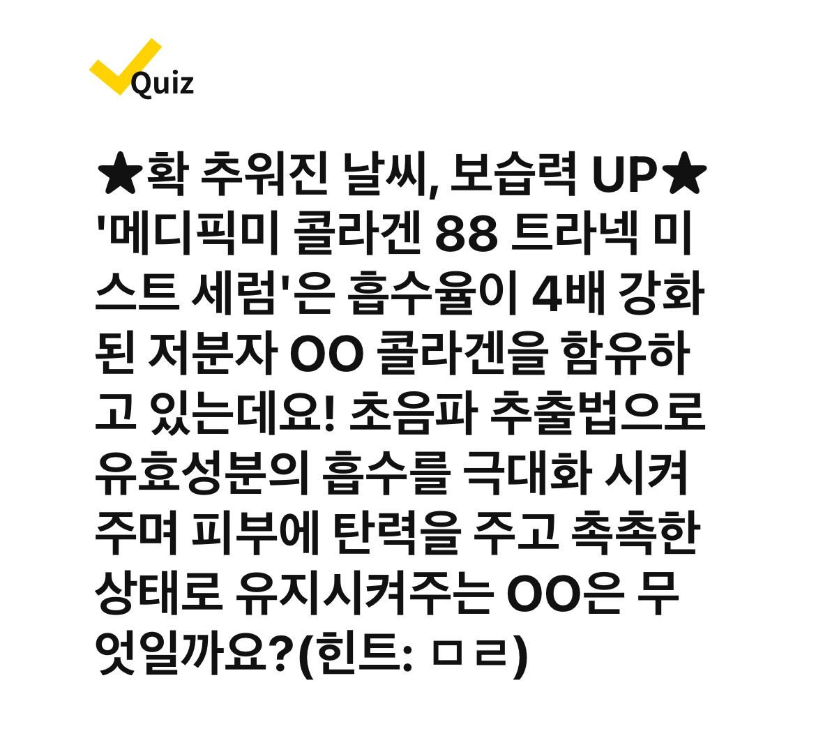 '메디픽미 콜라겐 88 트라넥 미스트 세럼'은 흡수율이 4배 강화된 저분자 OO 콜라겐을 함유하고 있는데요! 초음파 추출법으로 유효성분의 흡수를 극대화 시켜주며 피부에 탄력을 주고 촉촉한 상태로 유지시켜주는 OO은 무엇일까요?(힌트: ㅁㄹ)