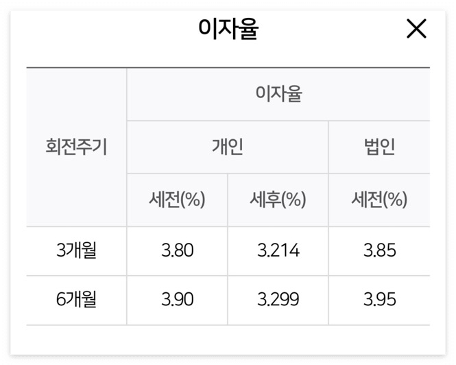 이 상품은 3개월 or 6개월 회전주기 선택에 따라 세전, 세후 이자율이 달라지니 참고해주세요.