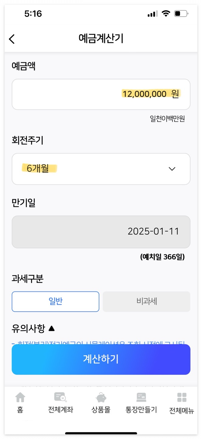 예금계산기로 계산해본 결과 일반 금리보다 만기 수령액이 더 많았어요.