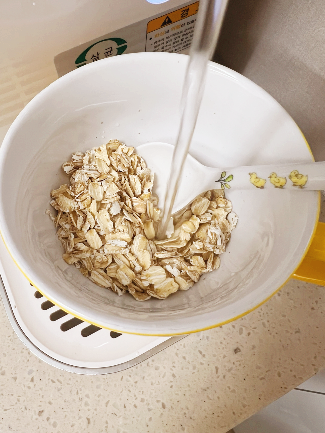 넓거나 깊은 그릇에 오트밀을 넣어요.