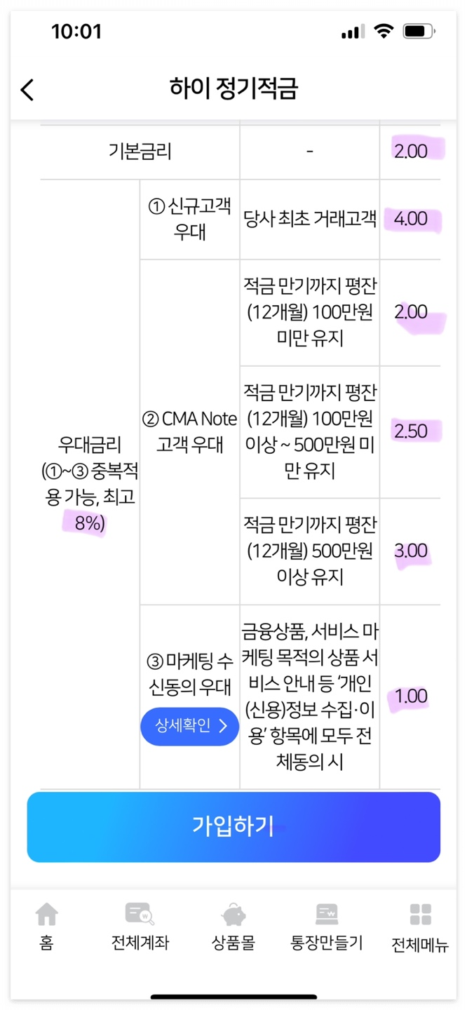우대이율은 아래와 같이 기본 2%에 우대금리 8%로 되어있어요.
