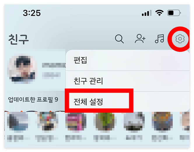 친구메뉴에서 톱니바퀴 아이콘 클릭!