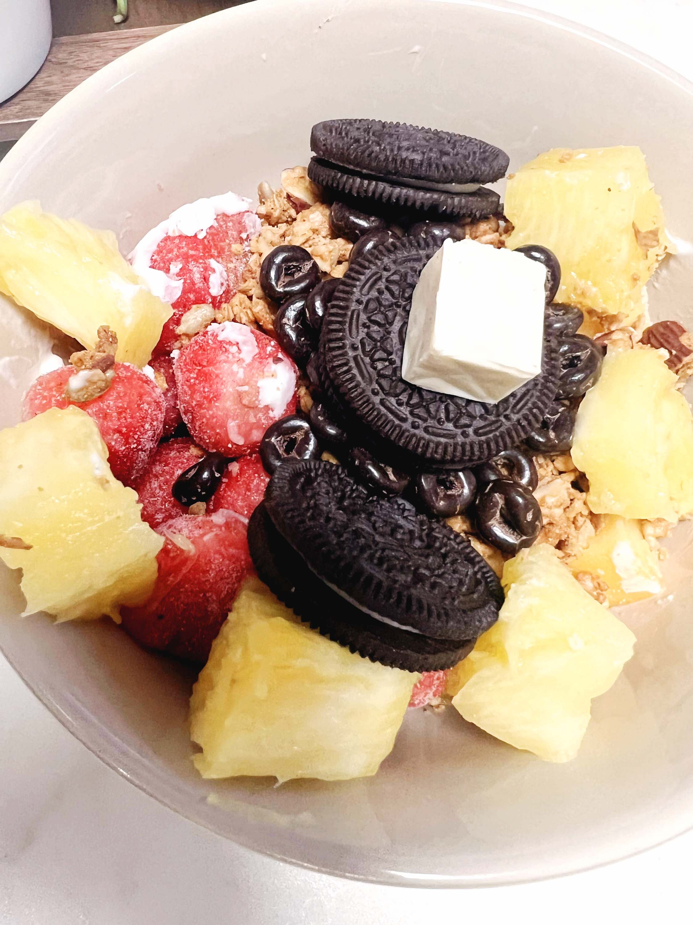 최근에 만들어 먹고 있는 요아정은 오레오도 넣고 파인애플에 큐브치즈까지 올려서,