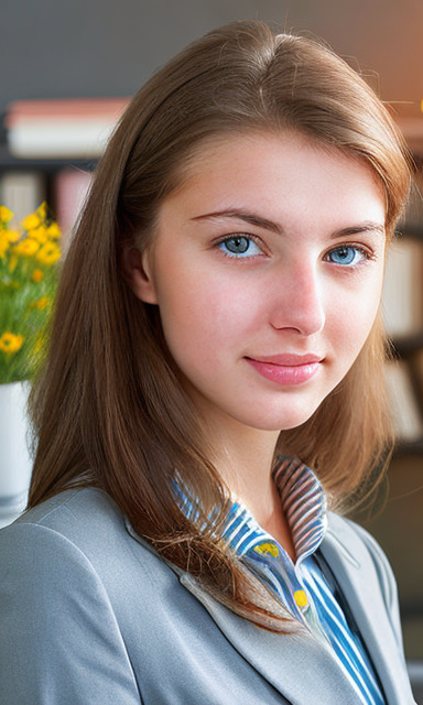 Prompt: 현대적이고 잘 정돈된 사무실 공간에 자신 있게 서 있는, 전문적인 복장을 한 20세의 아름다운 유럽 여성의 이미지를 캡처합니다. 이는 ISTJ의 책임감 있고 세부 지향적인 성격을 나타냅니다.