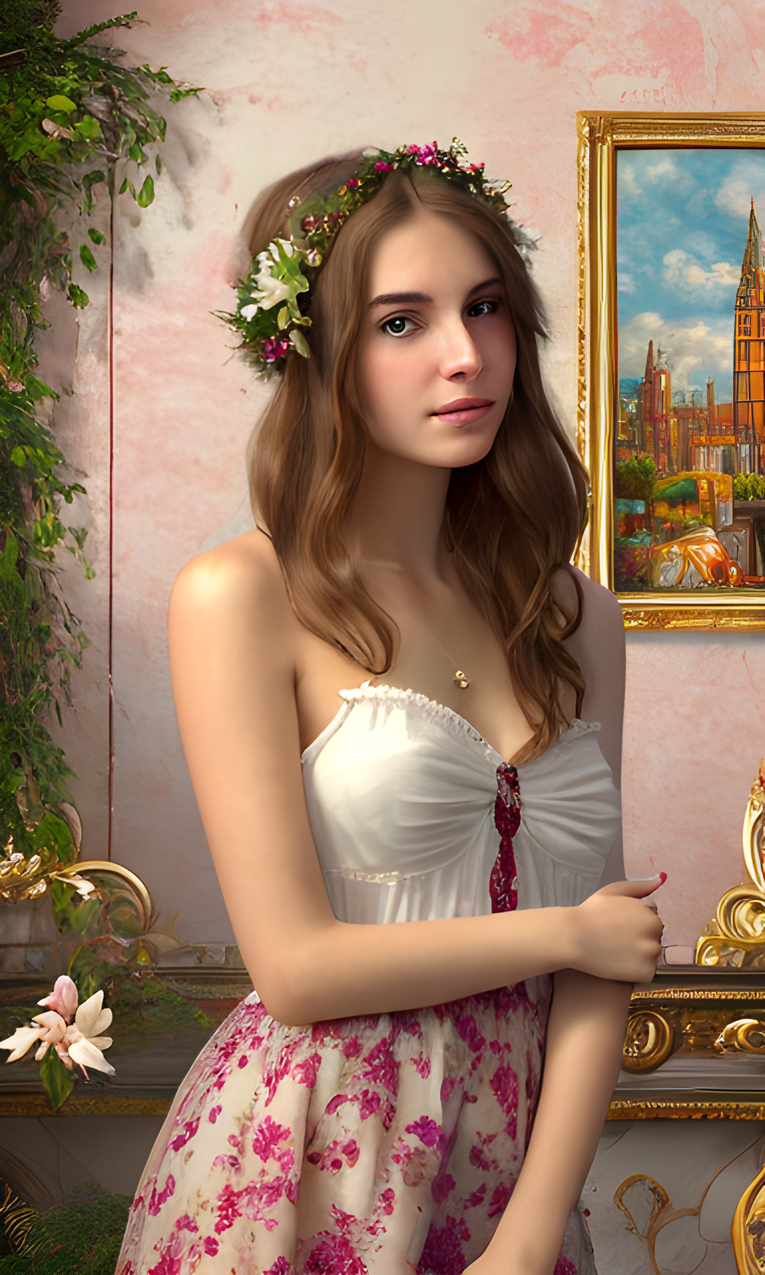 Prompt: 활기찬 유럽 예술품에 둘러싸여 있거나 우아한 유럽풍 장식이 있는 스튜디오에서 온화하고 예술적인 표현으로 20세의 아름다운 유럽 여성의 이미지를 만듭니다. 역사적인 유럽 도시 풍경이나 매력적인 유럽 정원과 같은 유럽 미학의 아름다움을 구현하는 배경에 그녀를 배치합니다.