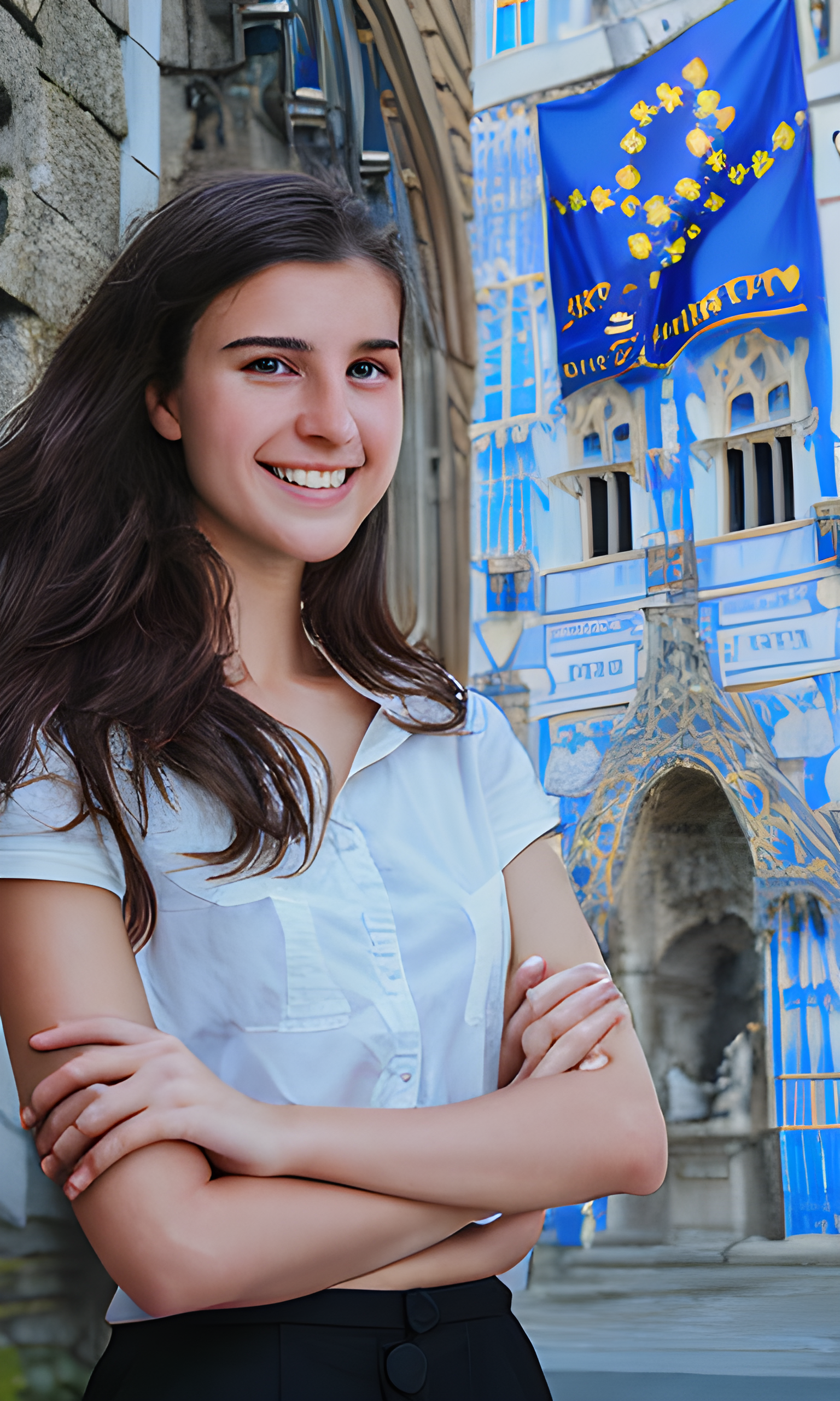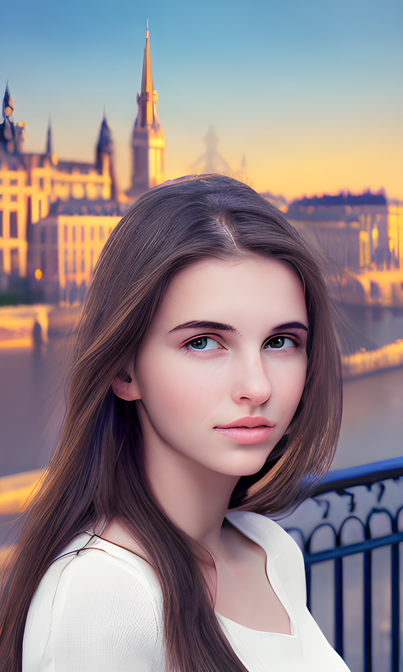 Prompt: 상징적인 랜드마크, 복잡한 건물 또는 역사적인 유럽 도시 경관과 같은 유럽의 건축적 경이로움을 보여주는 배경에 위치한 지적이고 사색적인 시선을 가진 20세의 아름다운 유럽 여성의 이미지를 만듭니다. 이는 INTP의 논리적이고 창의적인 특성을 반영합니다.