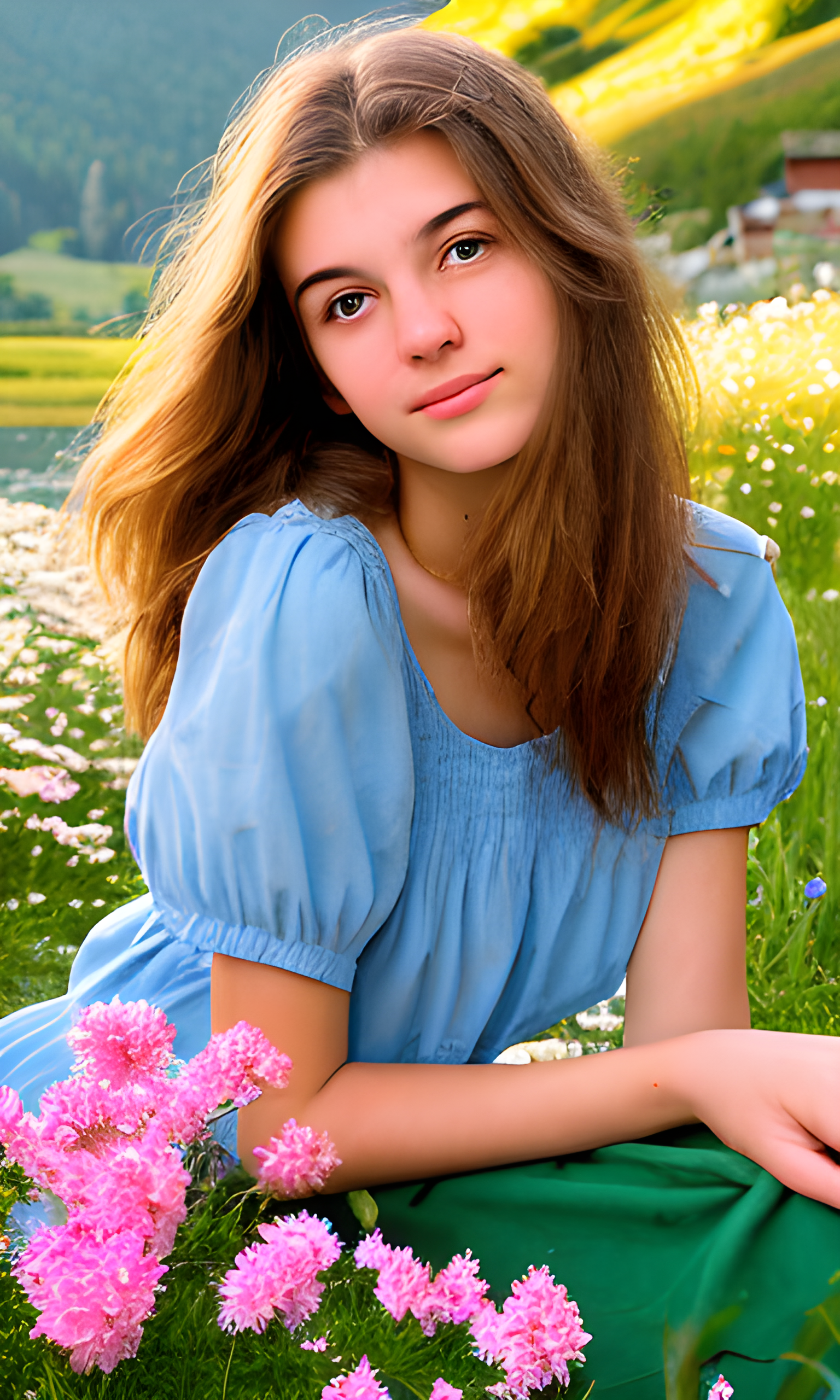Prompt: 구르는 언덕, 평화로운 호수 또는 그림 같은 해변과 같은 경치가 아름다운 유럽의 자연 경관을 배경으로 한 고요하고 내성적인 표정으로 20세의 아름다운 유럽 여성의 이미지를 캡처합니다. 꽃, 부드러운 햇빛 또는 아늑한 유럽의 오두막과 같은 평온함을 불러일으키는 요소를 포함합니다.
