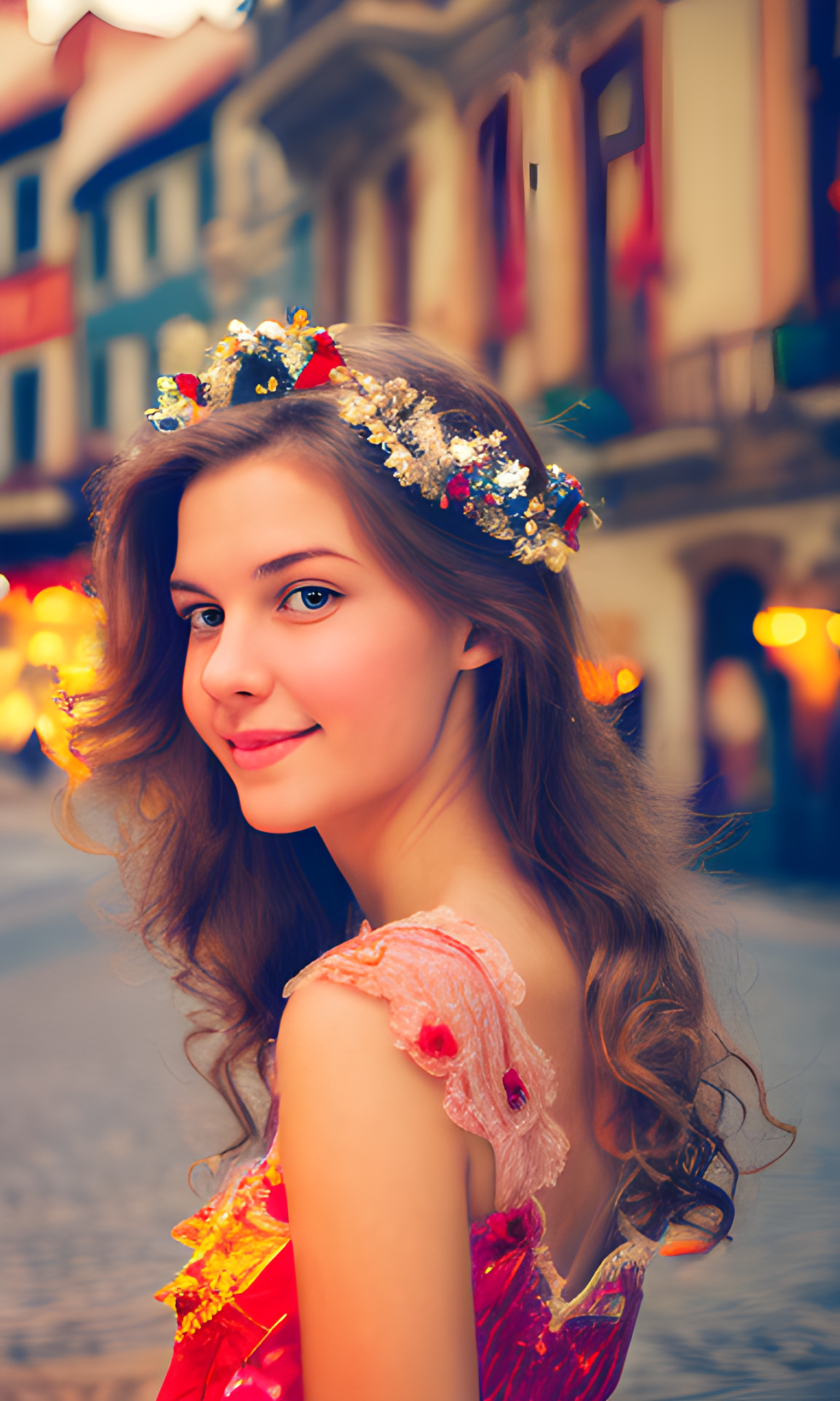 Prompt: 화려한 의상을 입은, 빛나고 표정이 풍부한 얼굴을 가진 20세의 아름다운 유럽 여성의 이미지를 만들어 보세요. 그녀를 유럽 극장이나 활기찬 문화 축제가 있는 활기찬 유럽 거리를 배경으로 하여 ESFP의 활기차고 재미있는 성격을 포착합니다.