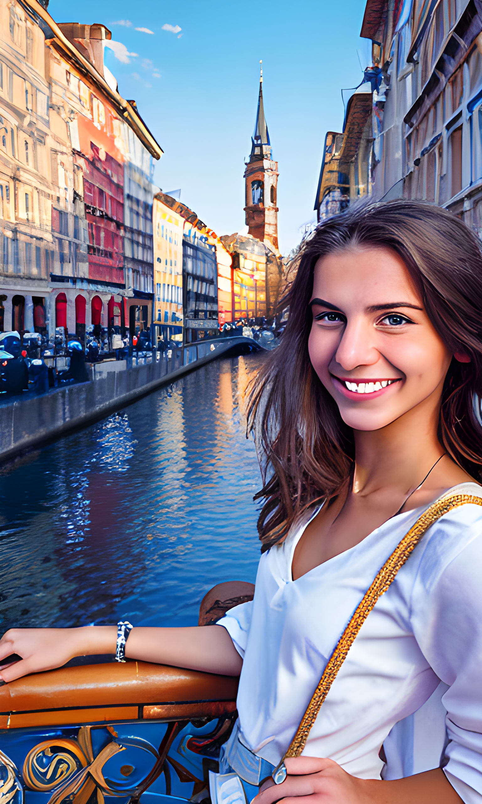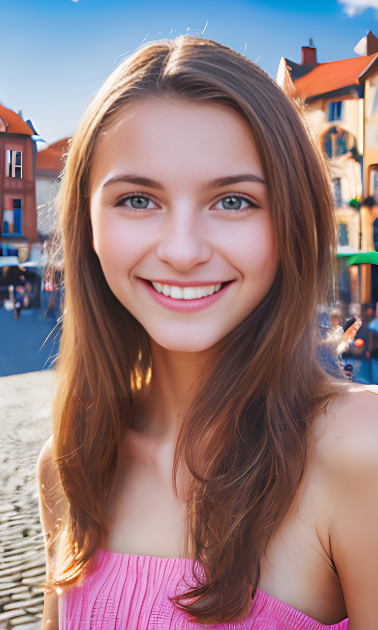 Prompt: 역동적인 유럽 도시 배경에 배치된 활기차고 카리스마 넘치는 미소를 가진 20세의 아름다운 유럽 여성의 이미지를 캡처합니다. 활기찬 도시 거리, 번화한 시장 또는 유럽의 상징적인 랜드마크와 같은 요소를 통합하여 ESTP의 모험적이고 외향적인 성격을 반영합니다.