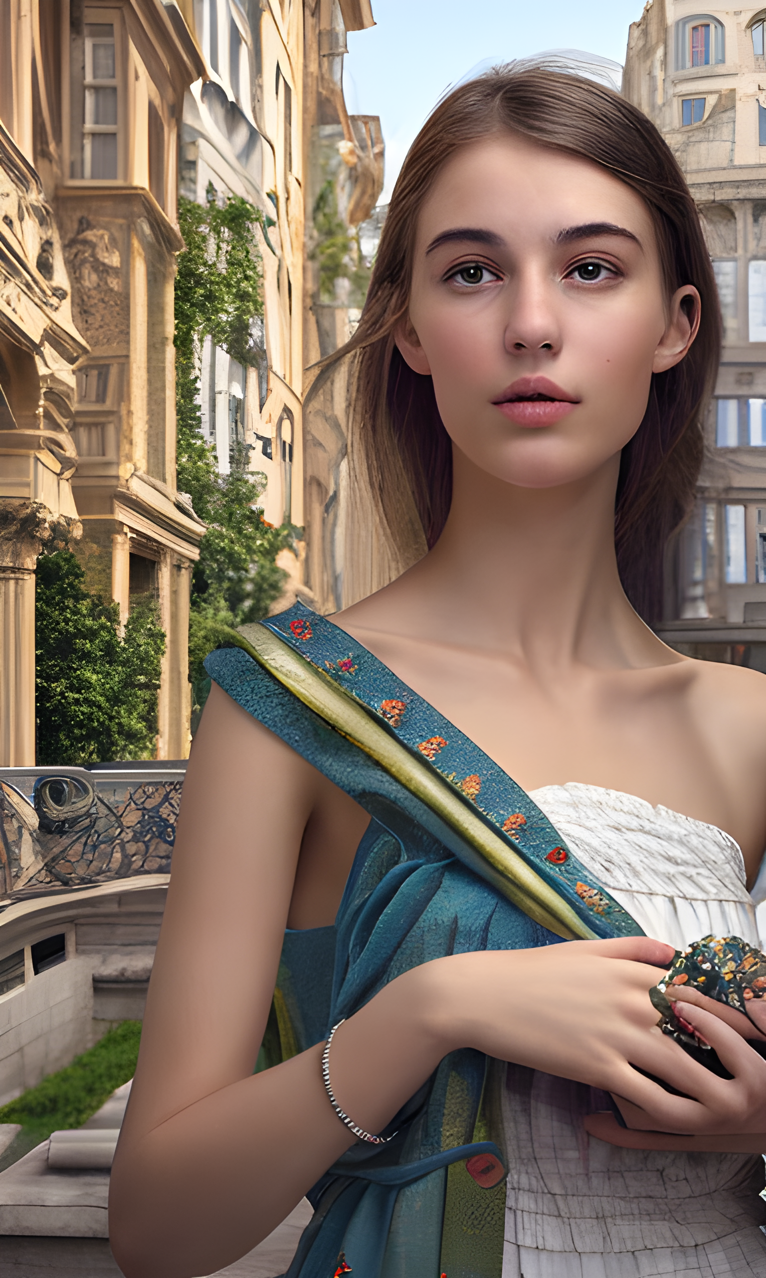 Prompt: 혁신과 유럽의 문화적 언급을 불러일으키는 요소들로 둘러싸인 호기심 있고 자신감 있는 시선으로 20세의 아름다운 유럽 여성의 이미지를 만듭니다. 현대적인 유럽 건축, 예술적인 유럽식 설치, 또는 미래적인 유럽식 설정을 결합한 배경에 그녀를 배치합니다.