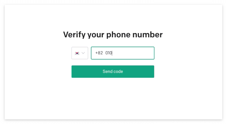 5. 성과 이름, 조직명, 생년월일을 입력하고 Continue클릭, 전화번호 입력 후 send code 클릭!
