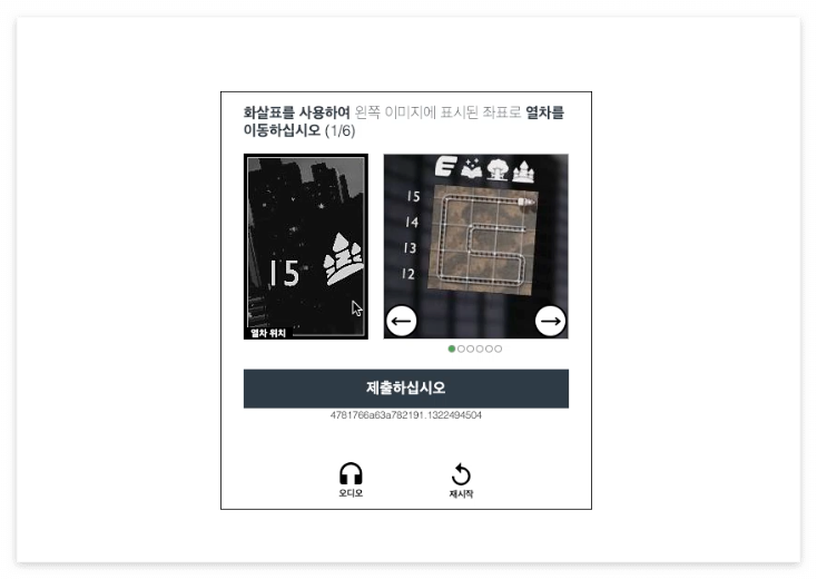 왼쪽, 오른쪽 화살표를 눌러 숫자와 모양에 맞게 열차위치를 맞추고 제출버튼 클릭해주세요.